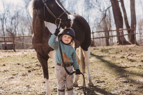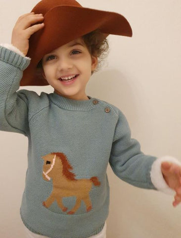 Keep your little one looking warm while being cozy this season in the Knitted Horse Sweater. The design is embroidered with a horse button-up shoulder detail, ribbed neck, wrist cuffs and bottom and stripe detail. It is crafted of a hundred percent cotton, the material is soft and gentle to your little one skin.