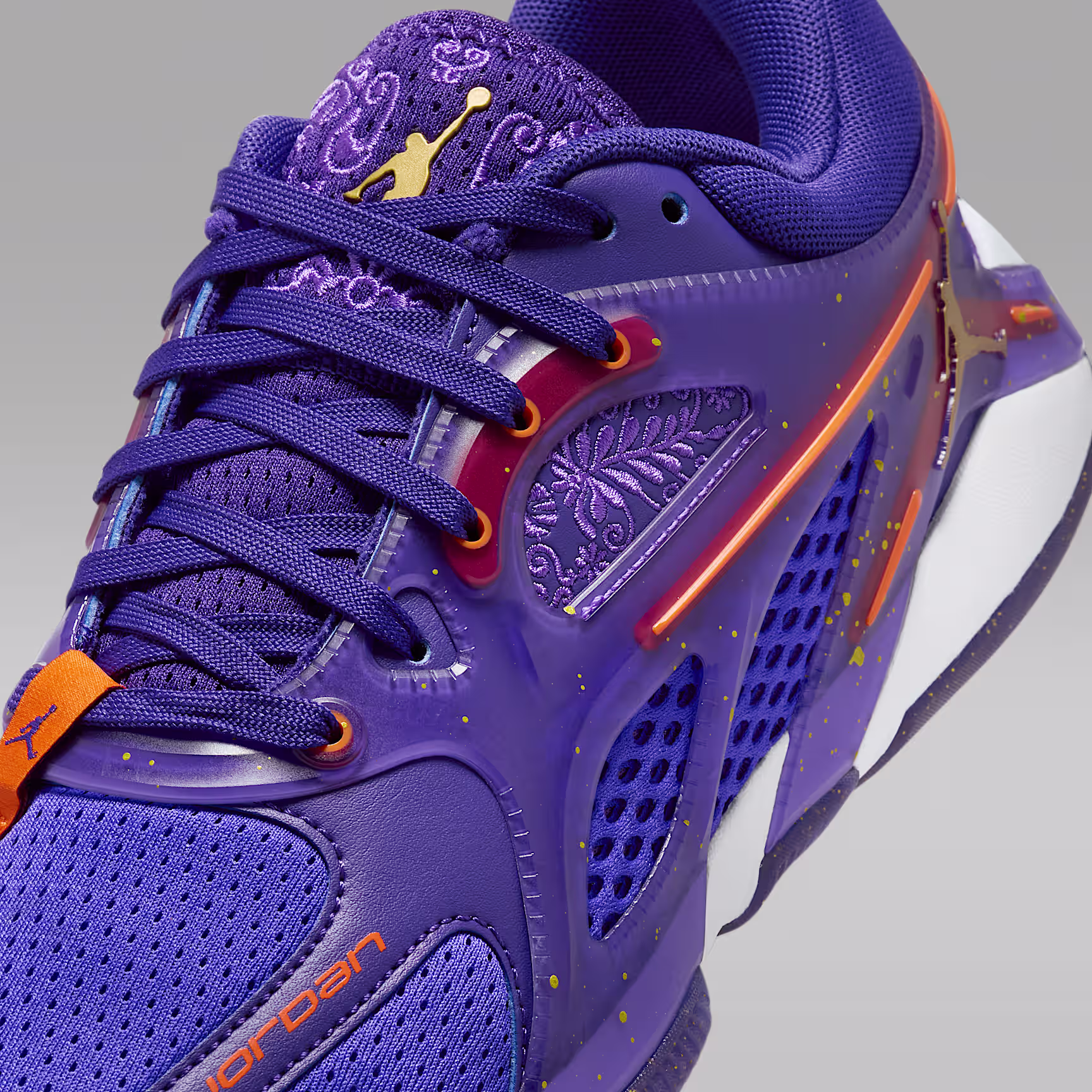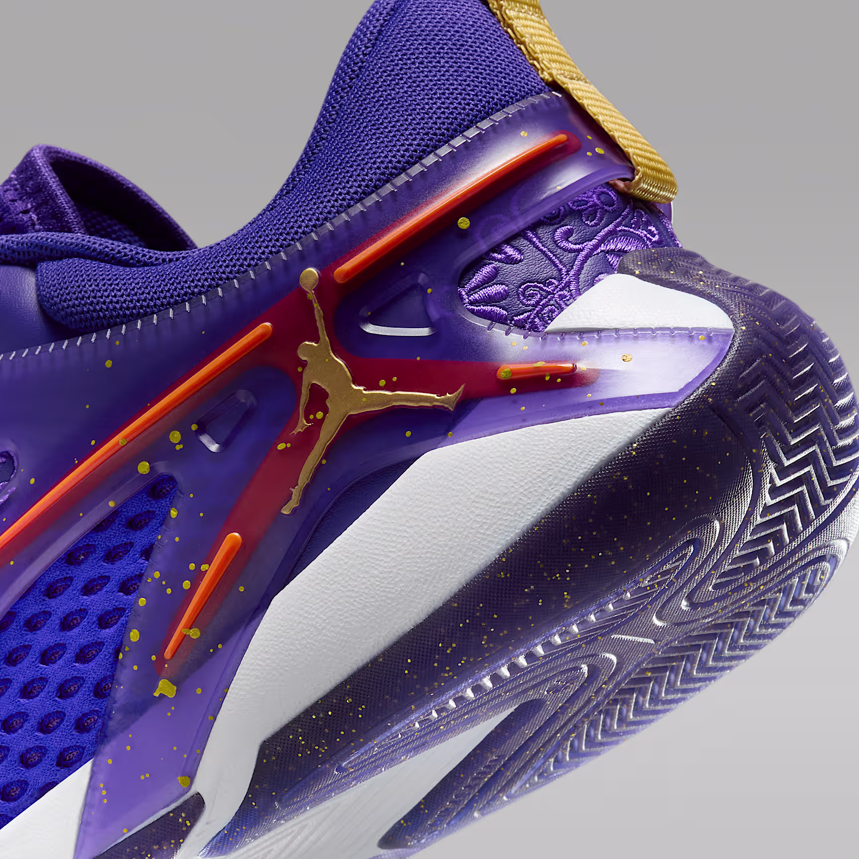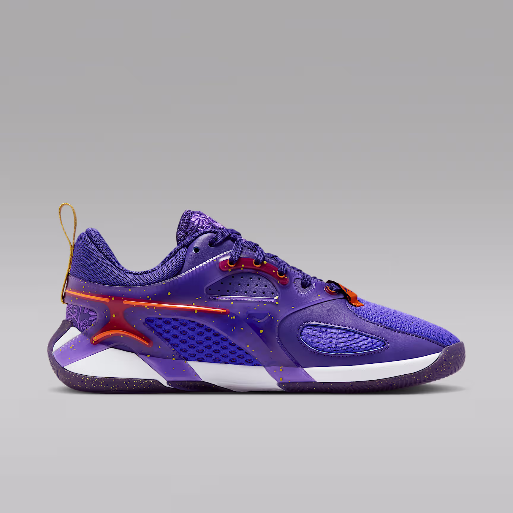 You're not afraid to claim your title and bask in life's luxuries. And this Heir Series is all about luxury. Rich shades of purple and gold mix with ornate embroidery for a regal look. Court-ready tech, like a drop-in midsole for extra mobility, a built-in cage for stability and herringbone traction for grip, help you show off your skills like the all-star you are.