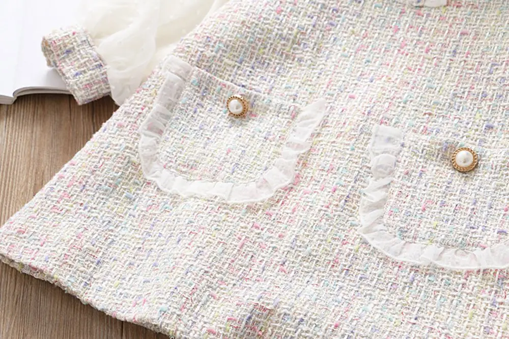 This long-sleeve lace dress will be a perfect addition to her occasion wear wardrobe. This sweet and playful dress features a peter pan collar with lace, knee-length with pearl buttons that add a touch of charm. The perfect dress for parties and special family occasions.
