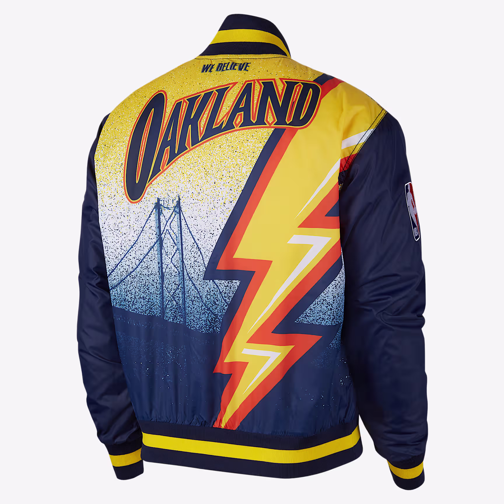The Golden State Warriors City Edition Courtside Jacket is inspired by the colours and graphics of the team's City Edition kit. It's a light and comfortable way to put your team on your back. With snaps down the front, the jacket features print and embroidered graphics and classic striped ribbing.