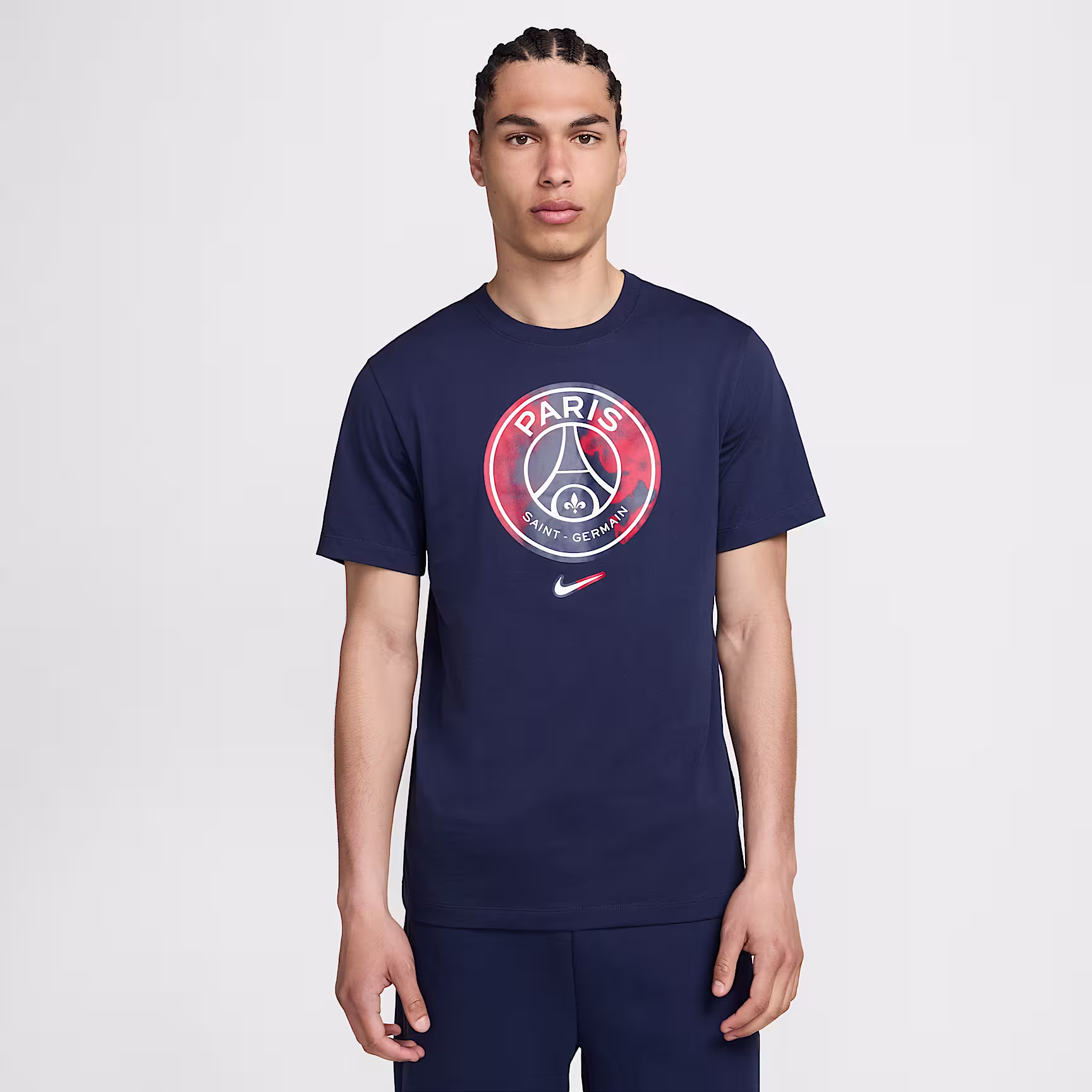 There's no mistaking where your loyalty lies when you're wearing this classic and easy-fitting Paris Saint-Germain tee. The squad crest you know and love stands prominently on the front of a soft cotton design, serving as a symbol of your undeniable support.