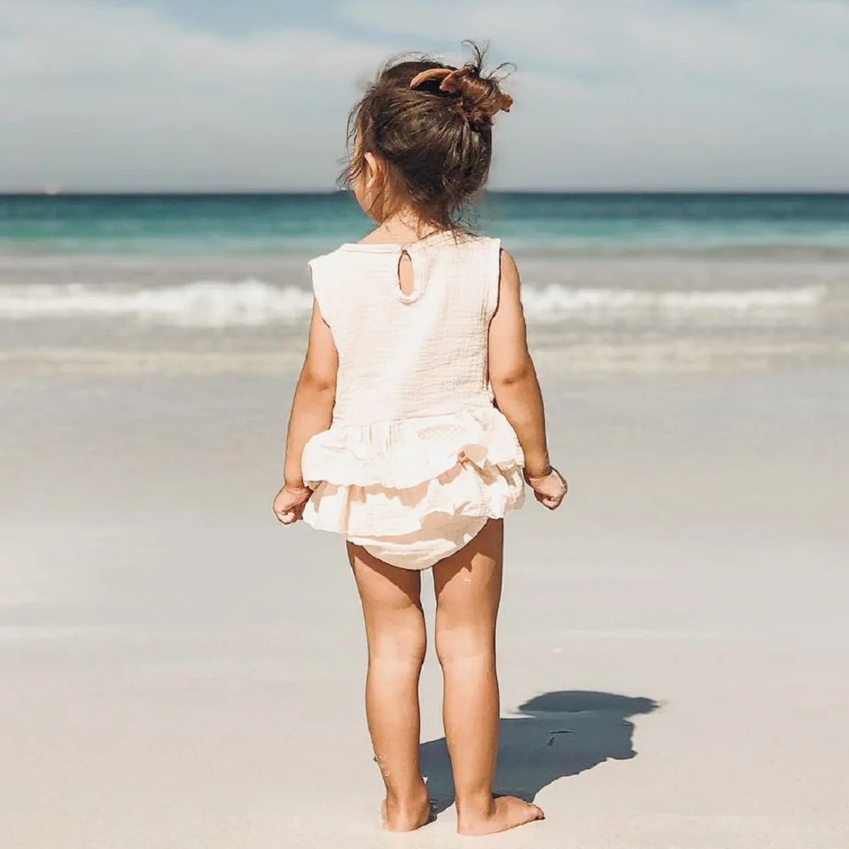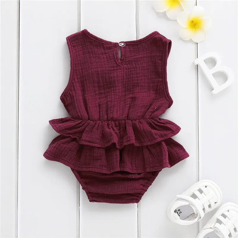 Plain solid color jumpsuit, ruffle shoulder, and back tie design highlights your little one's sweetness and make your baby stand out from a crowd.