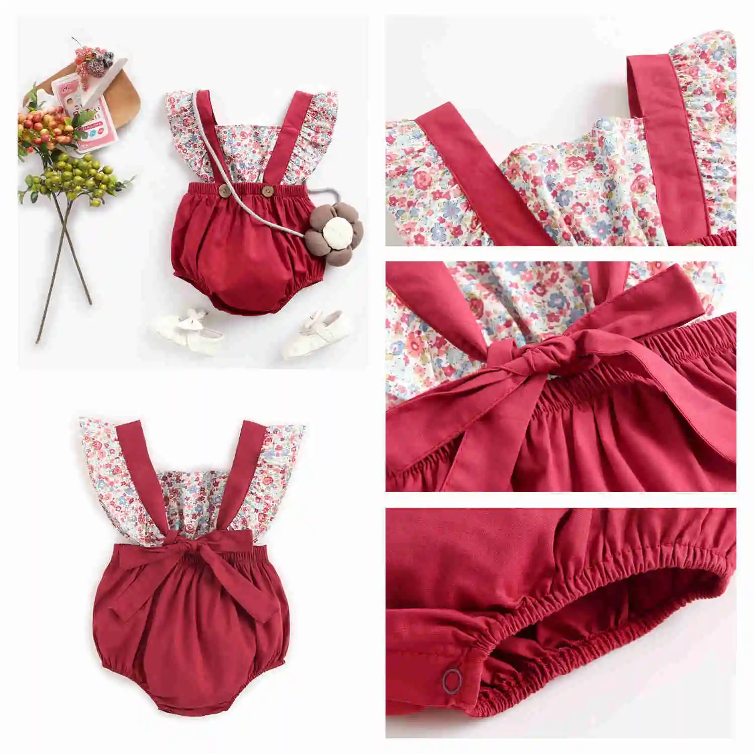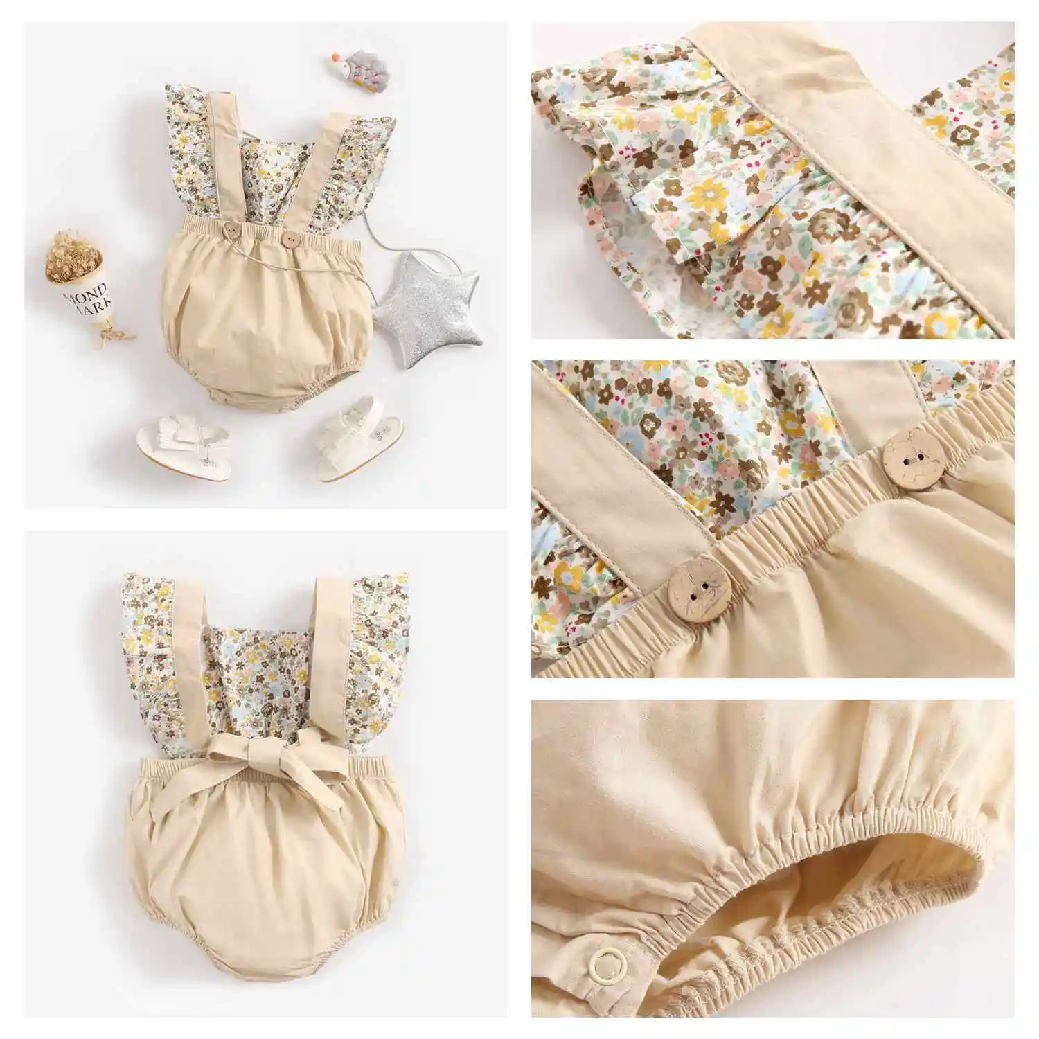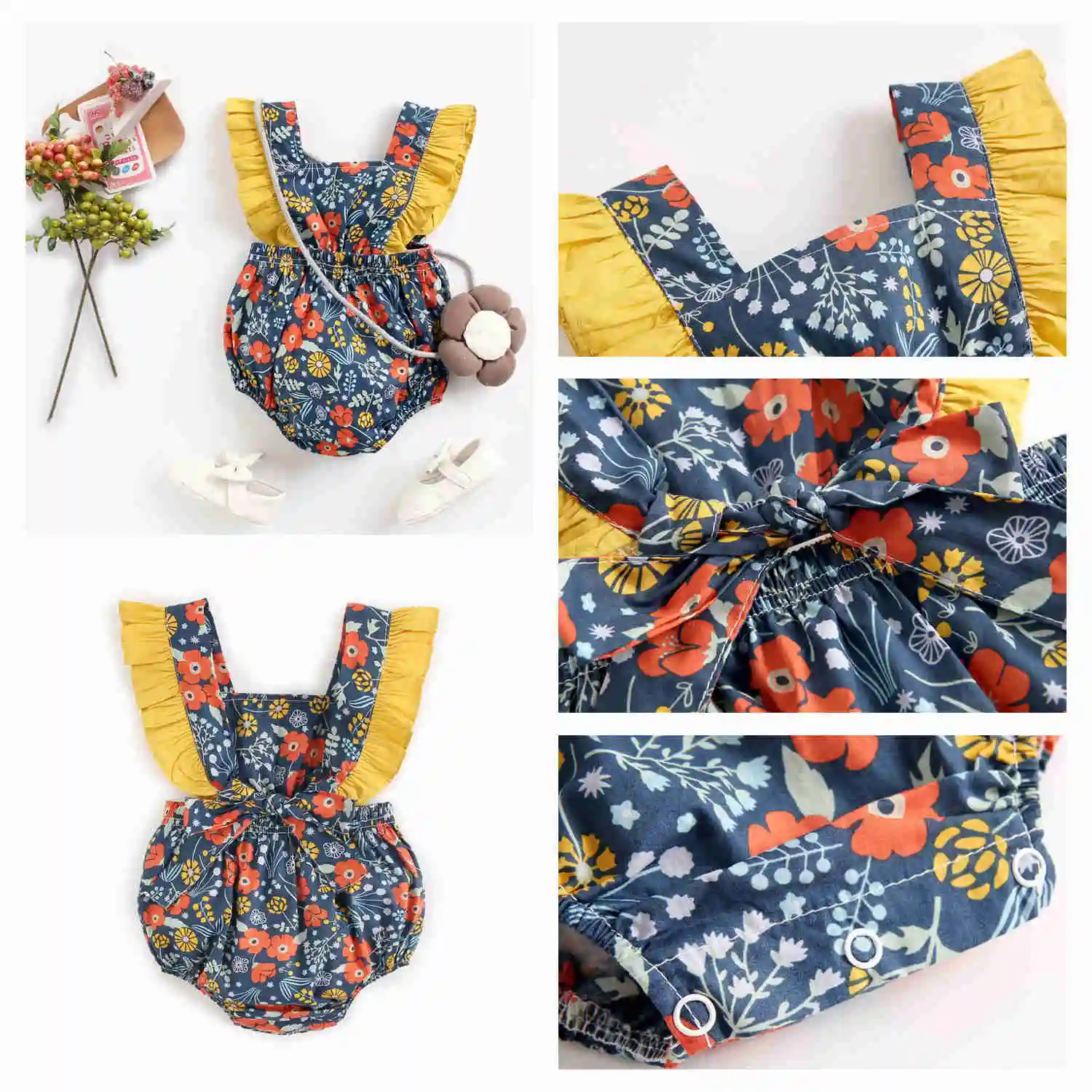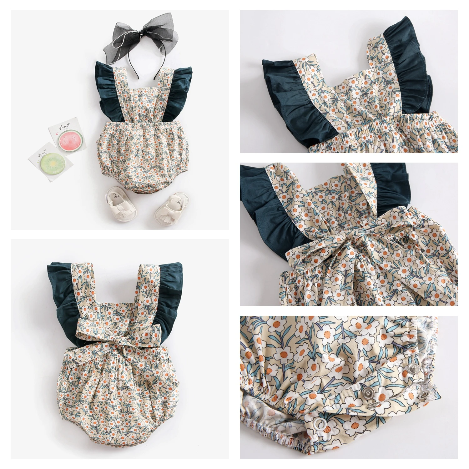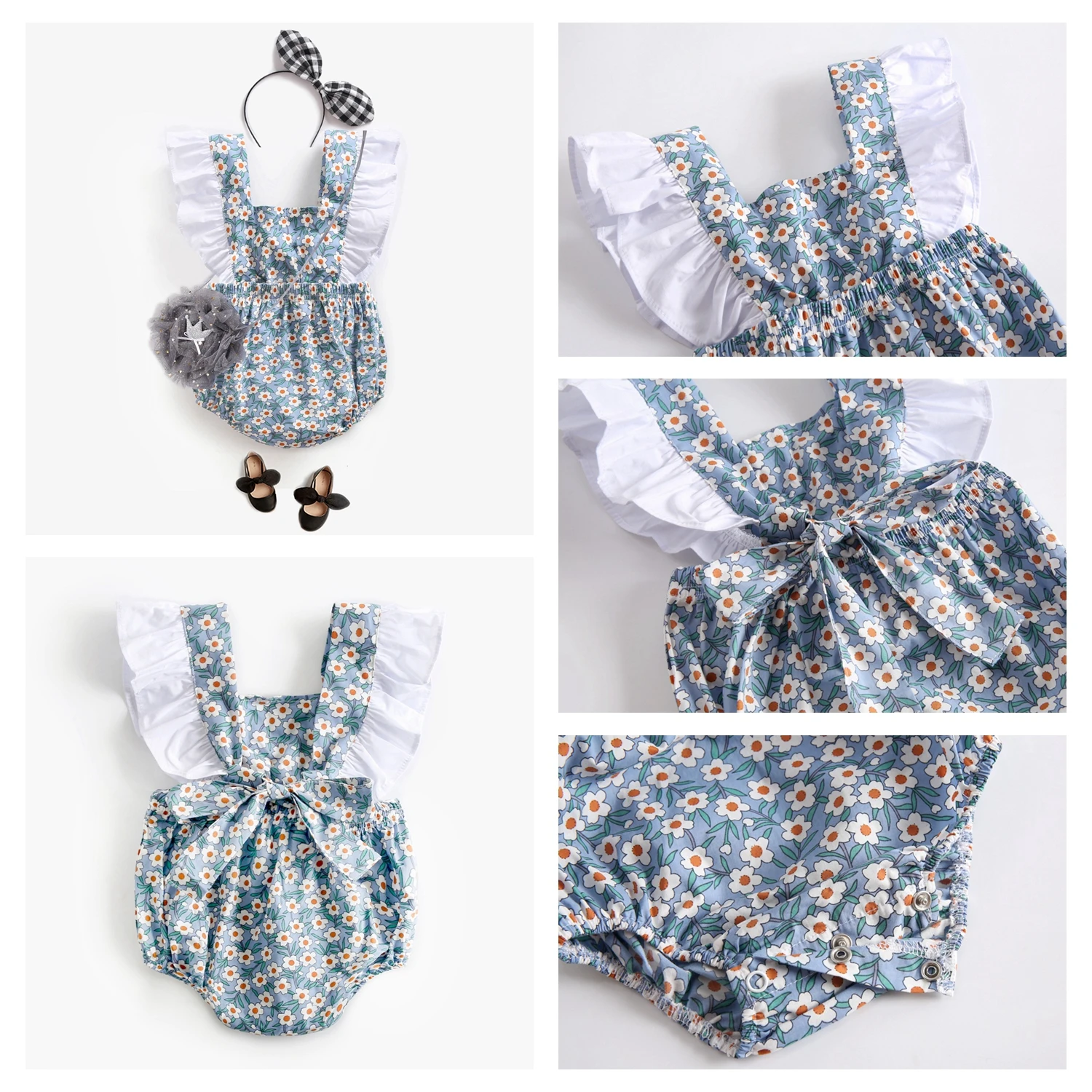 Dress your little one in this baby-printed romper for a summer-ready look.  Featuring soft frills and shoulder straps that tie into a beautiful bow at the back. This one-piece sleeveless and backless one-piece is perfect for warmer weather. The Baby Printed Rompers is a fashionable and functional wardrobe essential. Made with super lightweight cotton, they'll be comfy enough to play all day.