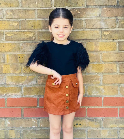 This tee with a short fur sleeve outfit is the perfect basic to have in your little one's wardrobe. It has a fur sleeve and makes this tee looks so adorable. In a feminine A-line silhouette, this classic style features a high waist, two front pockets and has buttons down the front for a '70s vibe. It looks great with boots in the cooler months and sandals when it's warm.