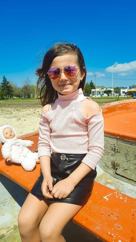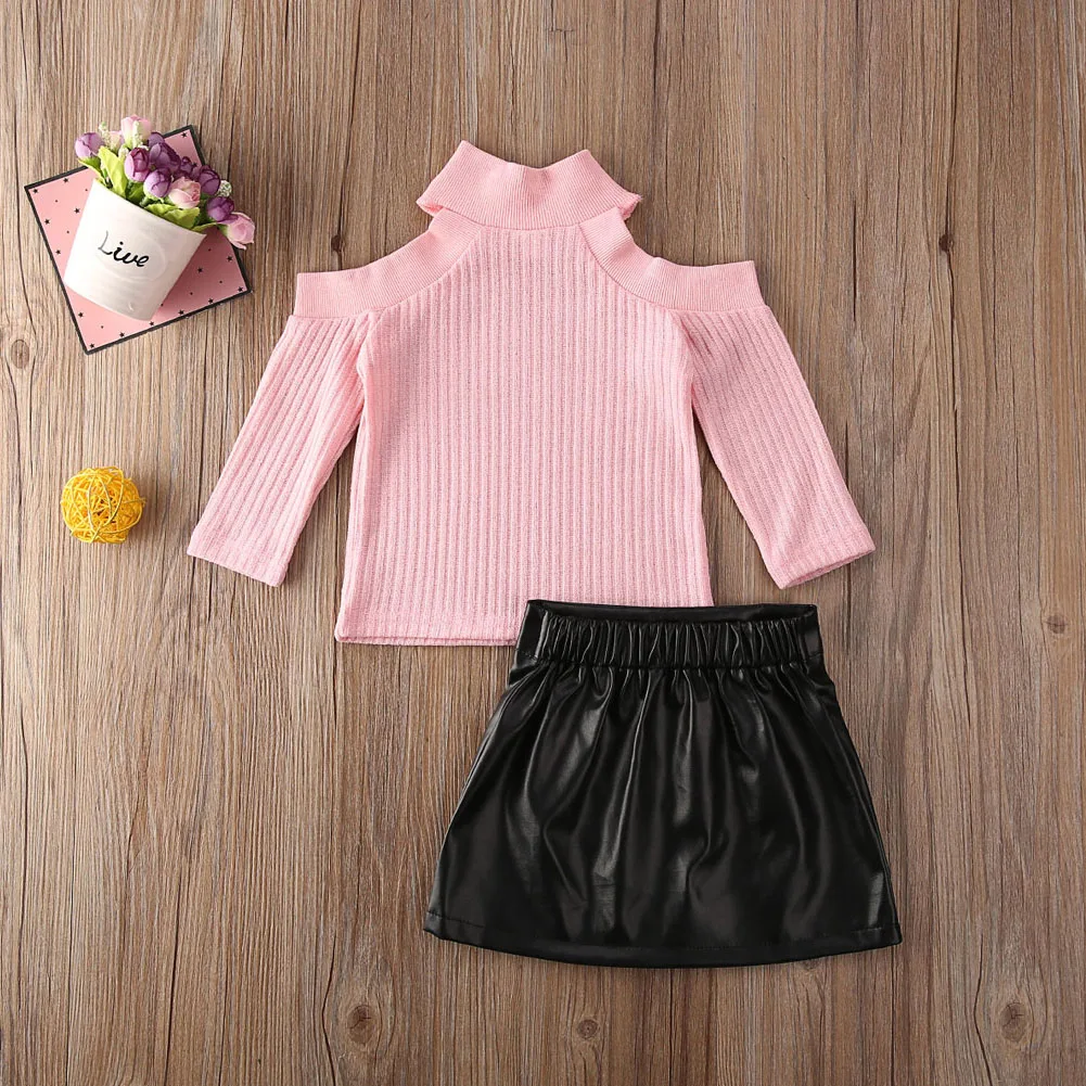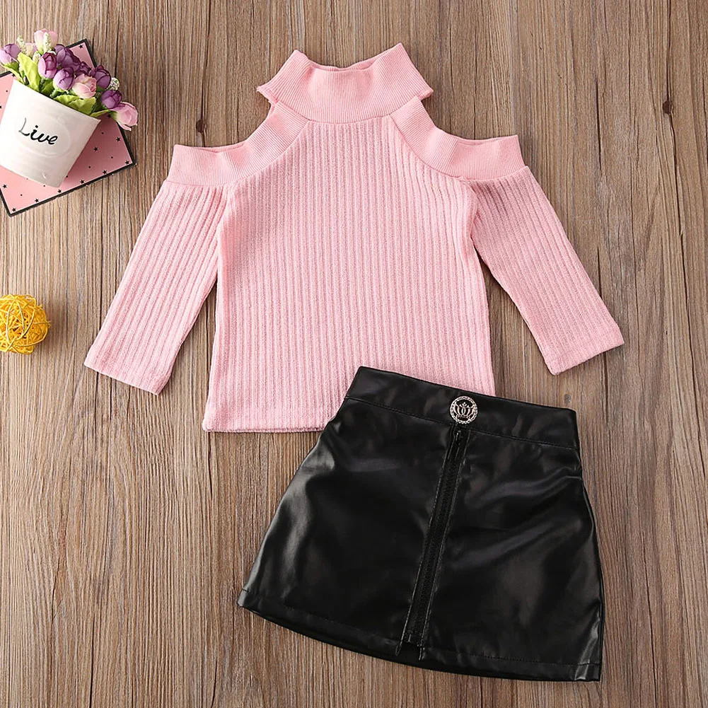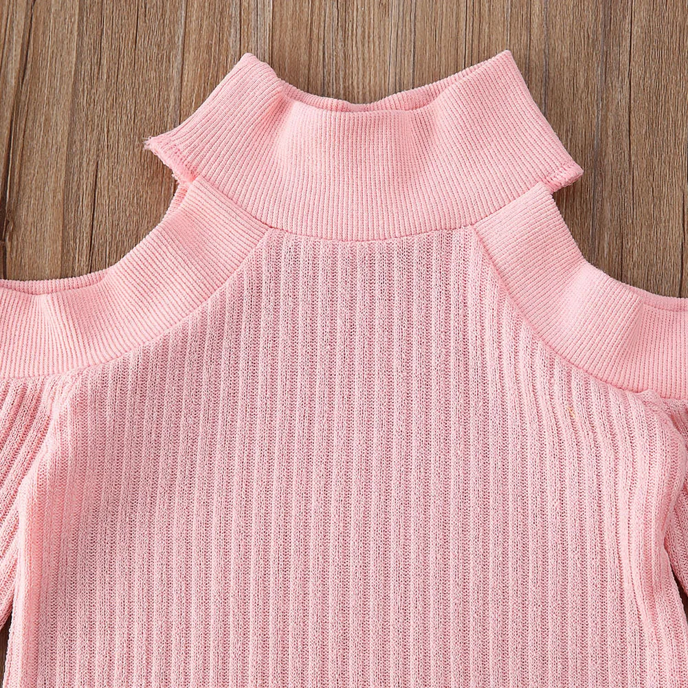 An off-shoulder knitted sweater in a cotton blend. It is made of high-quality material. The material is soft and gentle to the baby's skin.  This top comes with a matching A-line mini skirt.